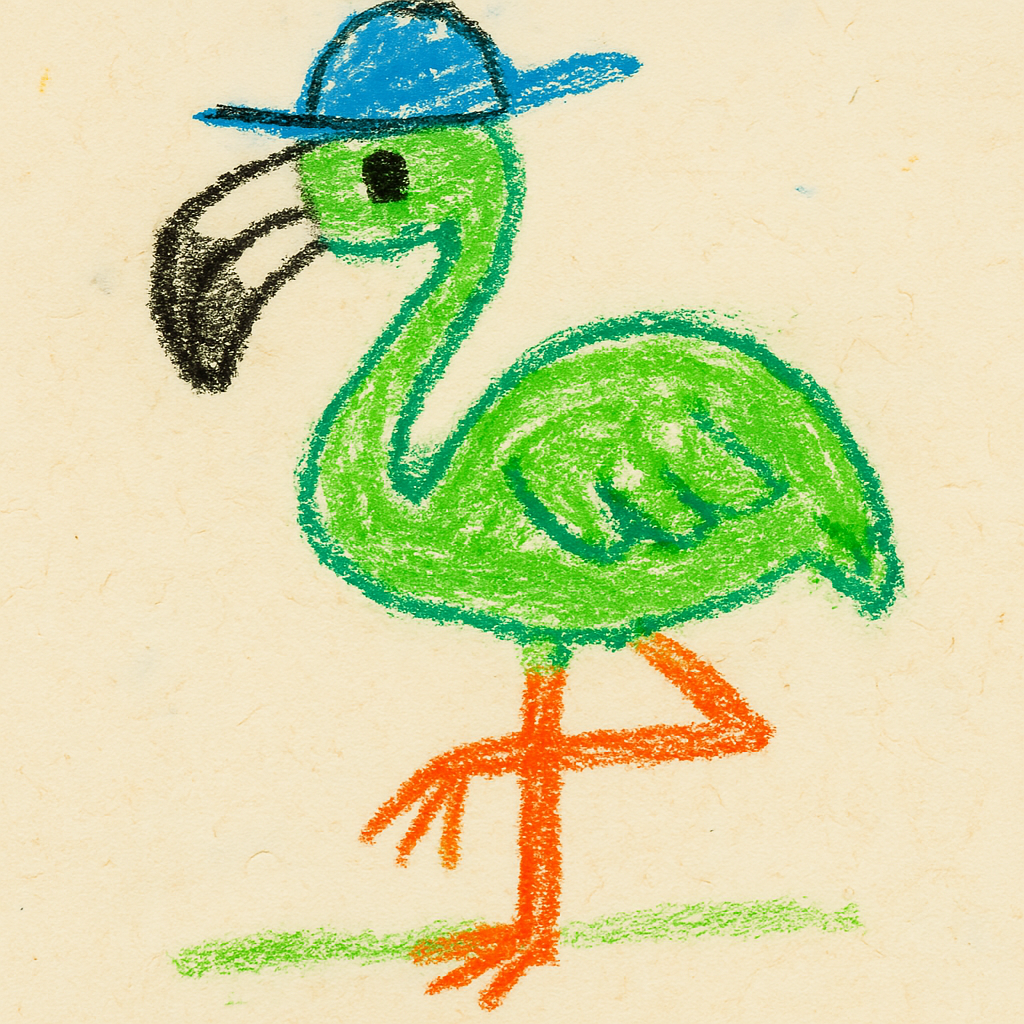 Prompt: “Generate an image that looks like it was drawn by a kindergarten student of a green flamingo wearing a baseball cap”
